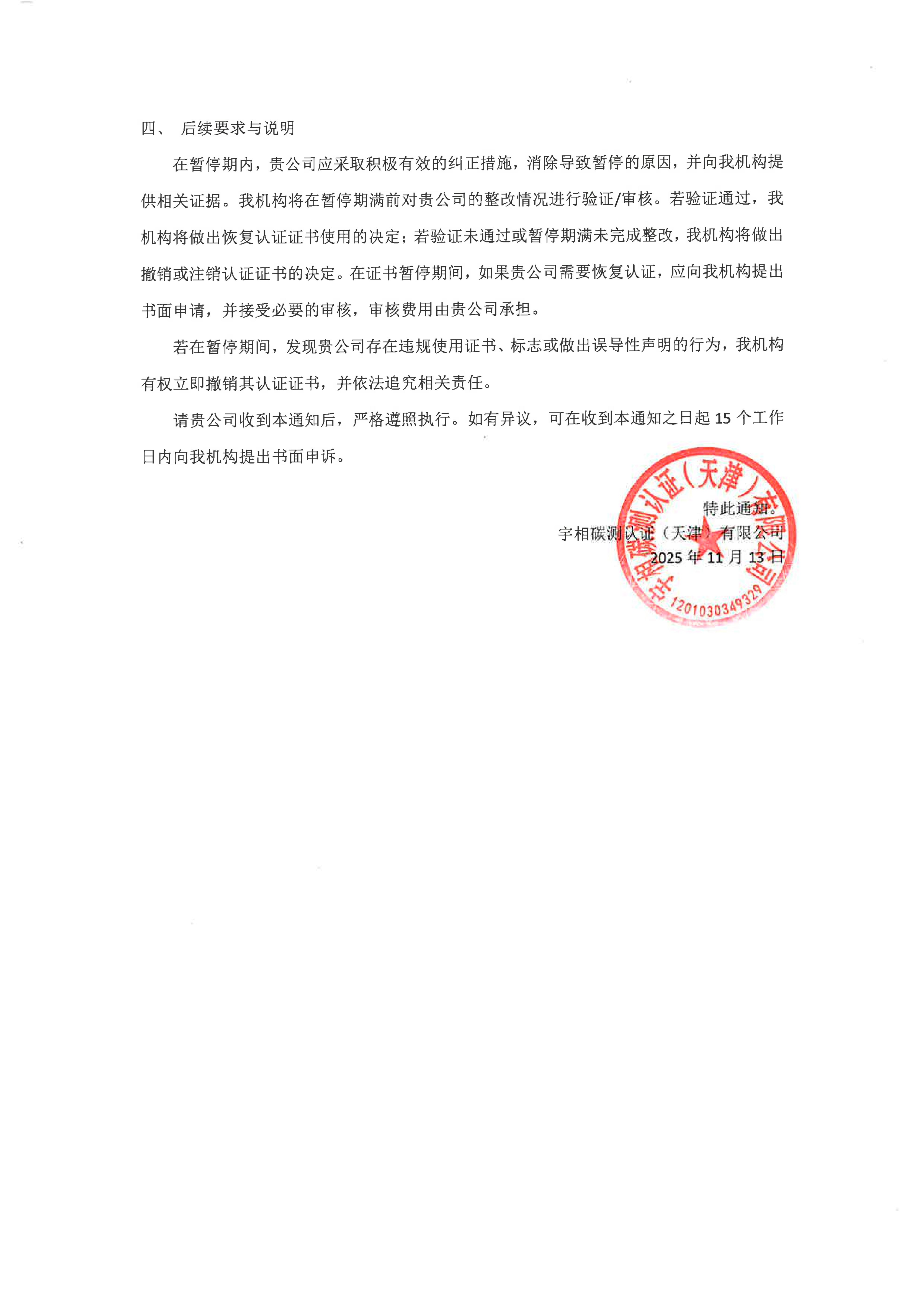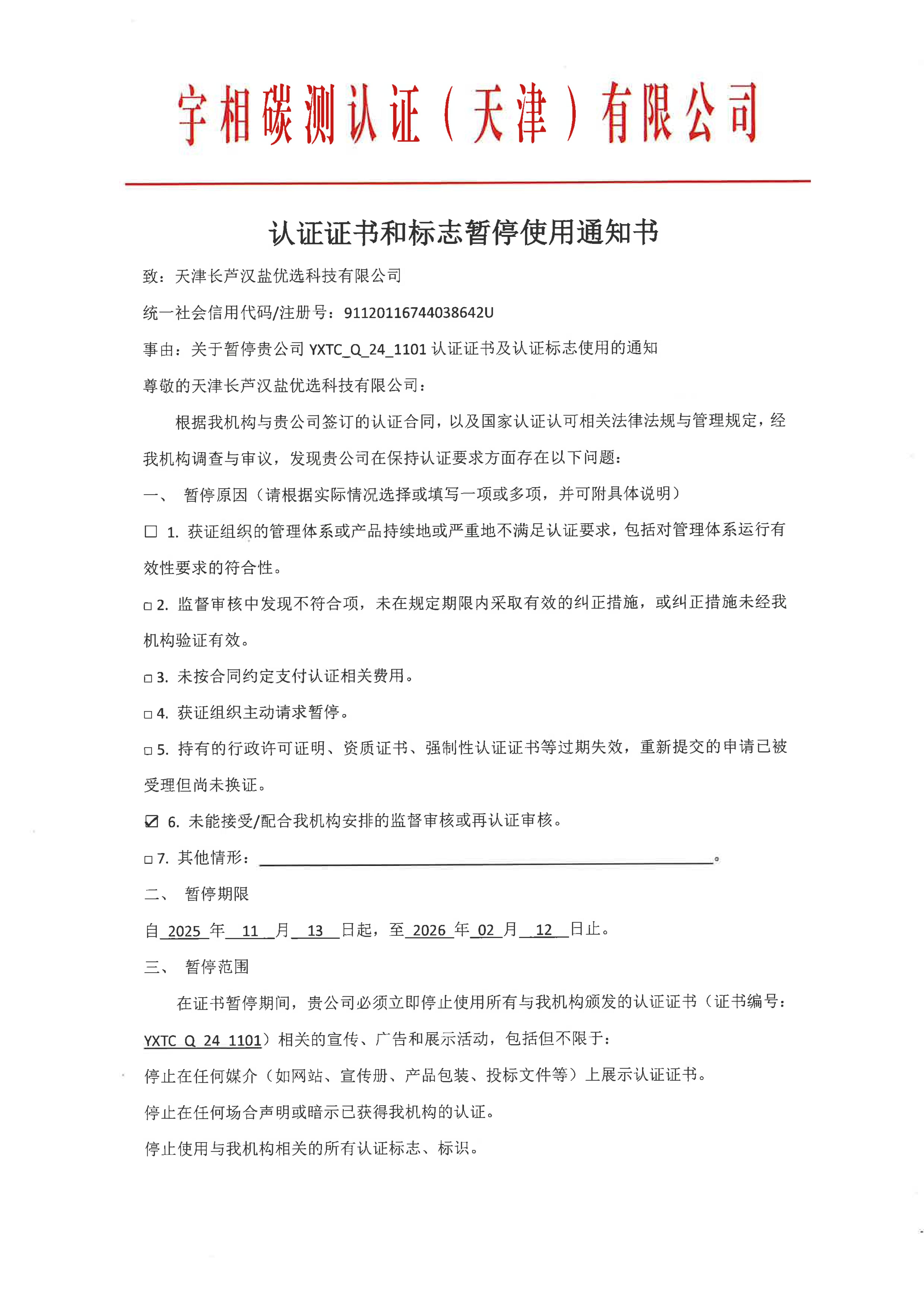天津长芦汉盐优选科技有限公司-质量管理体系认证证书-暂停通知