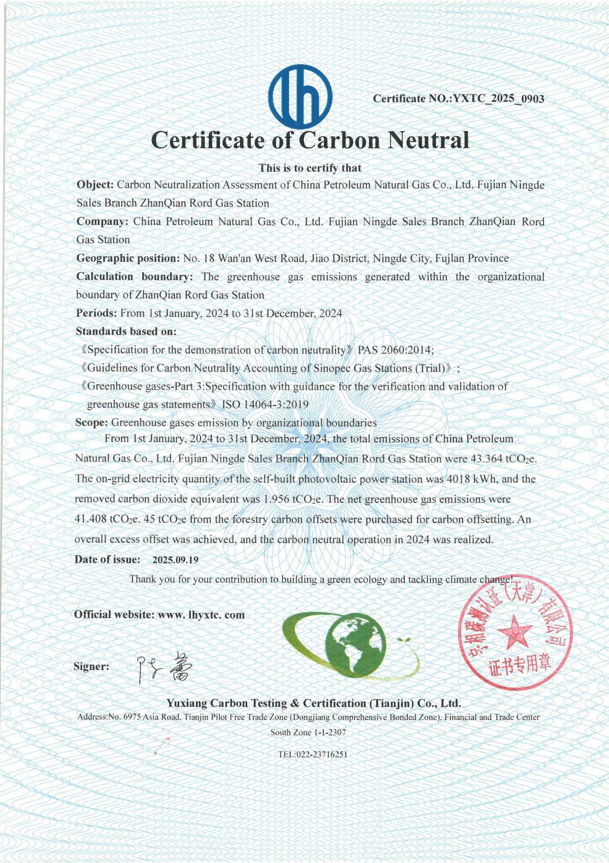 YXTC_2025_0903中国石油天然气股份有限公司福建宁德销售分公司站前路加油站碳中和证书