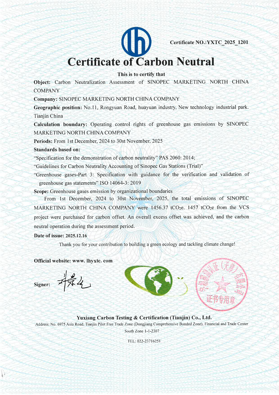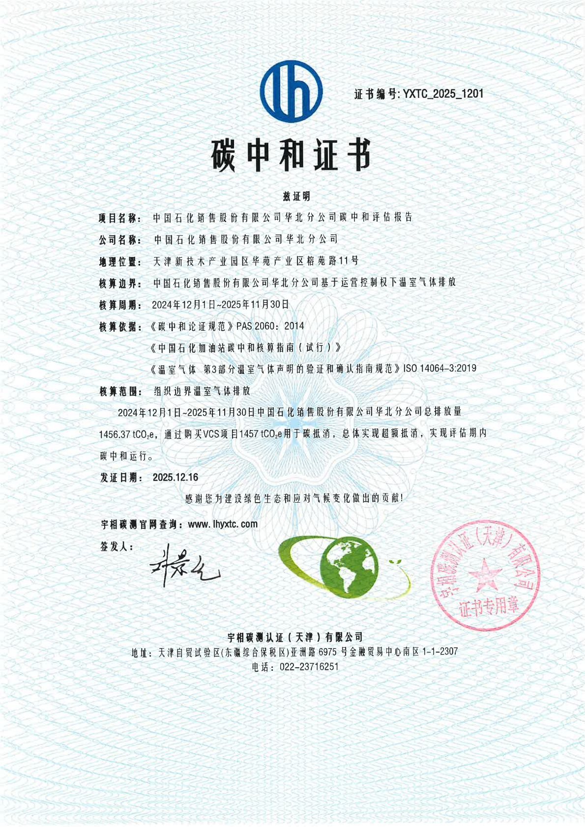 YXTC_2025_1201中国石化销售股份有限公司华北分公司碳中和证书