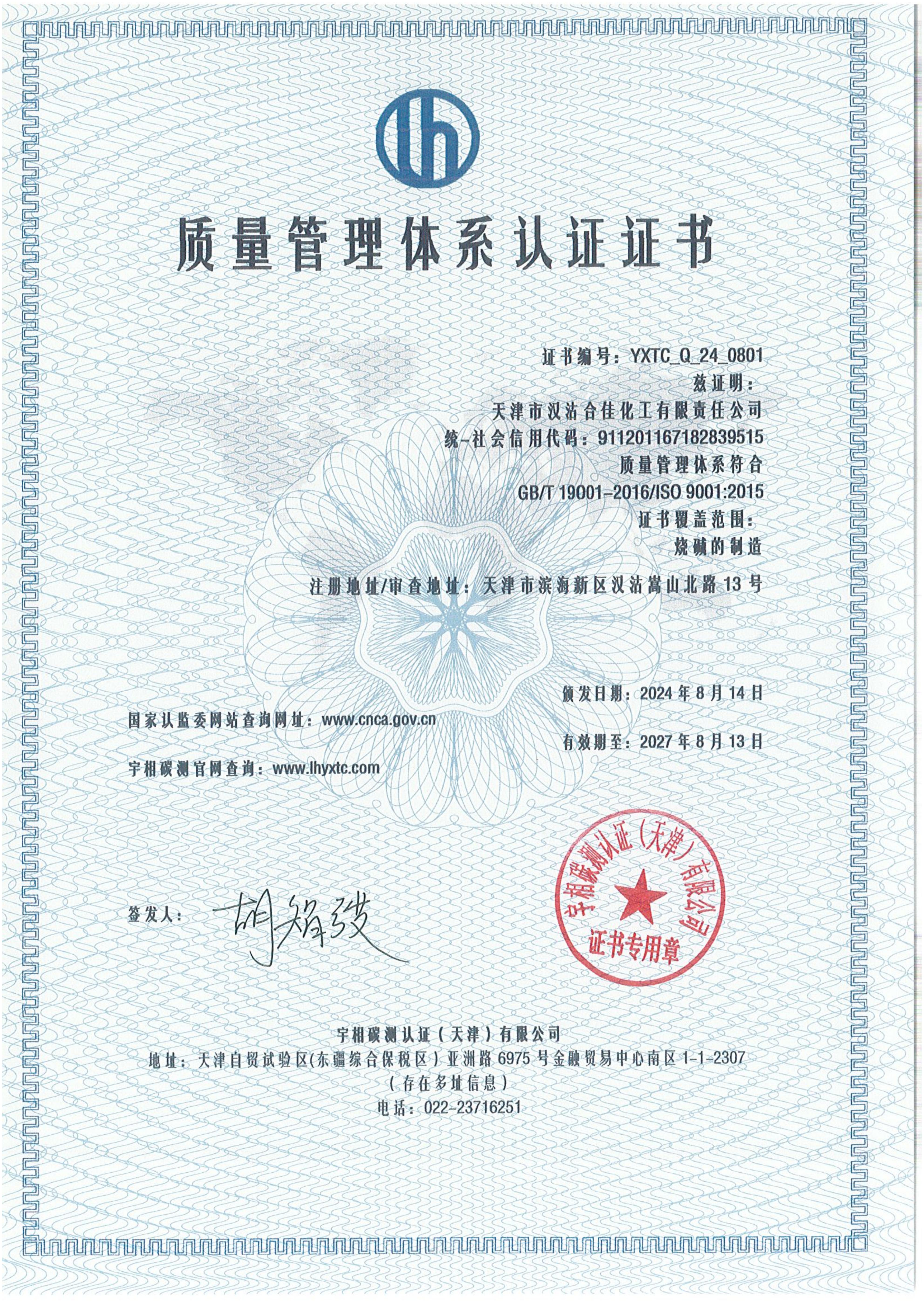 天津市汉沽合佳化工有限责任公司-质量管理体系证书